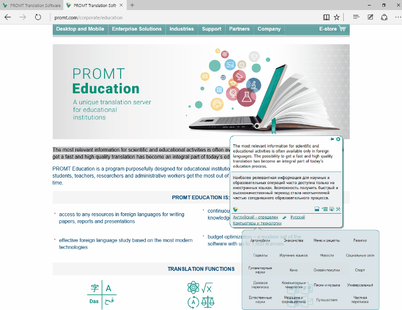 Built-in dictionaries and profilesPROMT already has various translation profiles installed, which make text and document translation on certain topics easy. You will get a precise translation without loss of quality. |